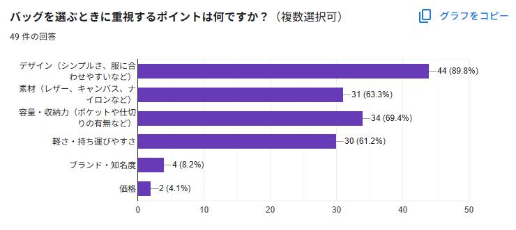 「素材」を重視する声も6割以上あり、特に本革レザーやナイロンといった質感や耐久性が選択基準になっています。