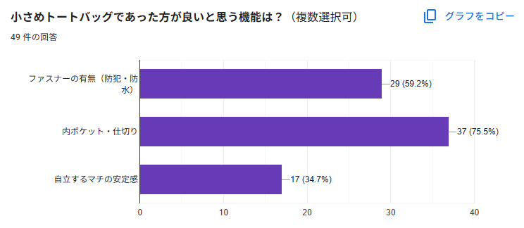 このグラフは、「小さめトートバッグであった方が良いと思う機能は?」という質問に対して、約50名の方から回答をいただいたものです。