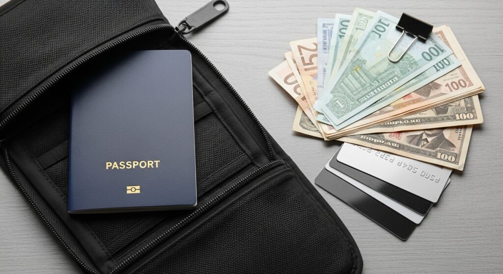 複数のポケットで紙幣・カード・パスポートを整理でき、海外旅行に最適。