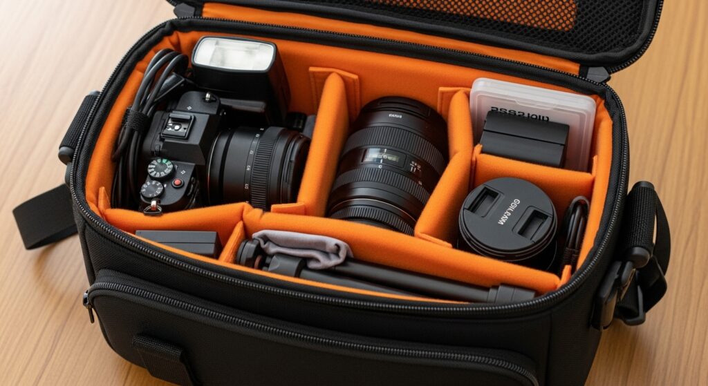 厚手のクッションやパッド入りの仕切りが、衝撃や振動からカメラを守る。