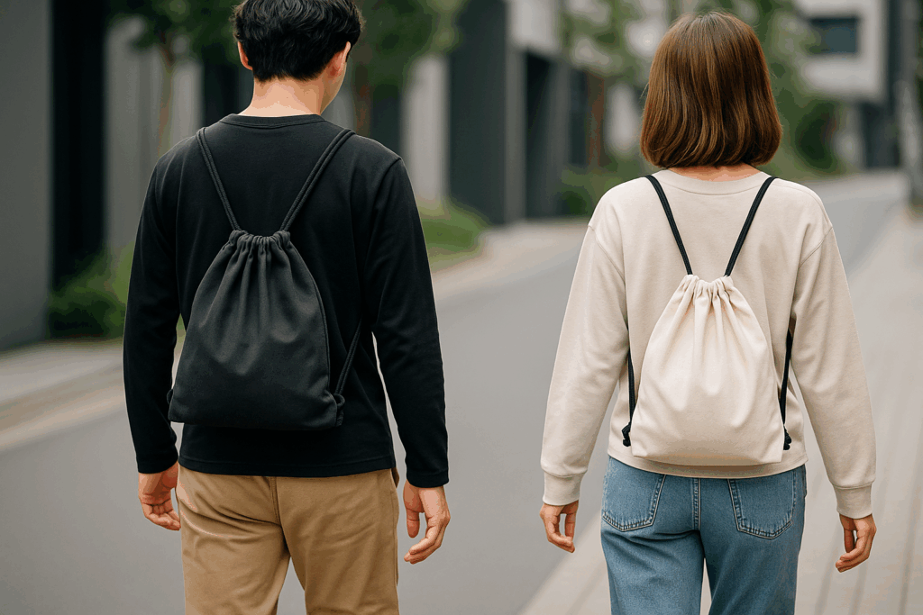 肩紐を引き絞って開閉する、軽量でシンプルな巾着型リュック。
