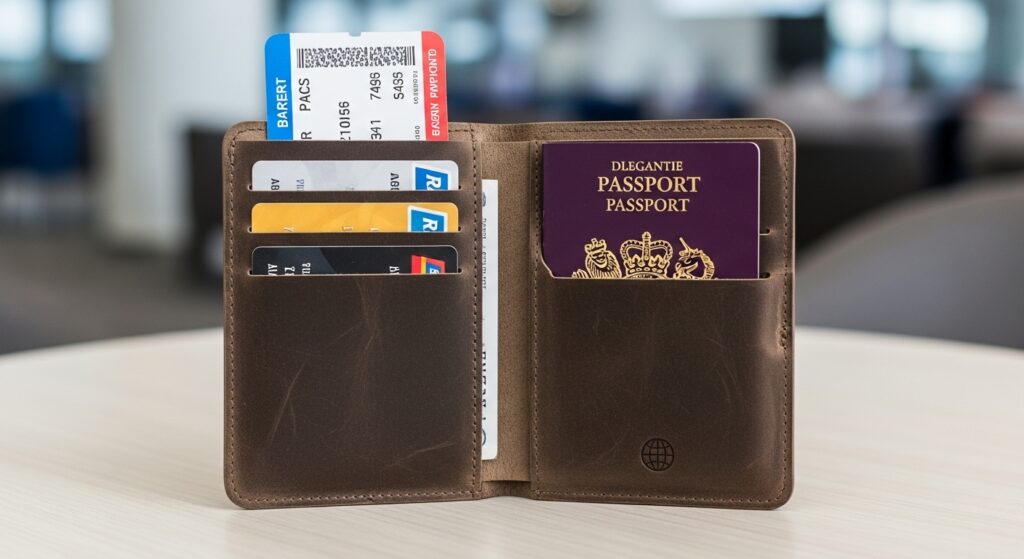 パスポートを保護し、旅の必需品をまとめて収納できるケース。