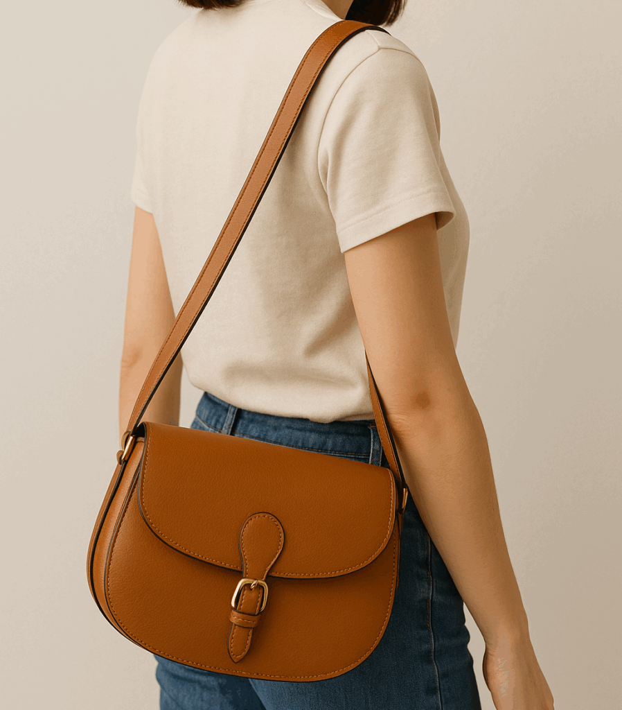 馬の鞍(サドル)をイメージした、丸みのあるフラップが特徴のバッグ。