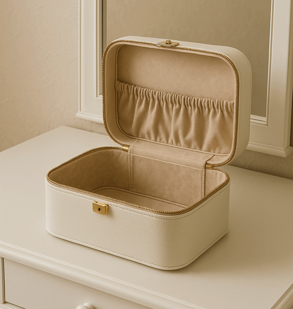化粧品やアクセサリーを美しく整理するための箱型ケース。