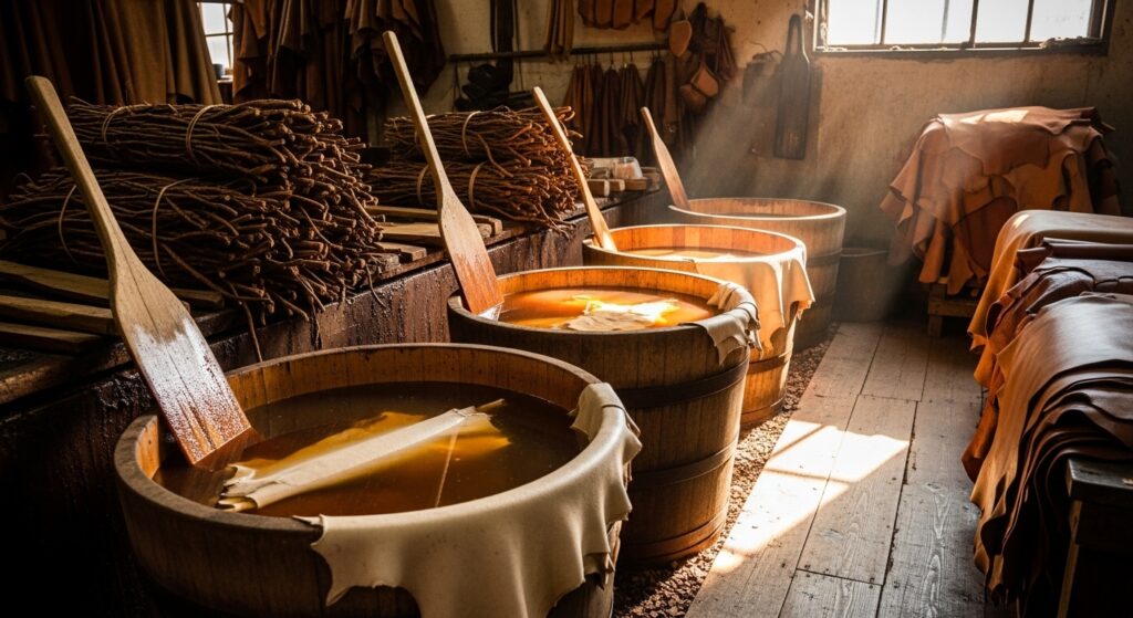 植物由来のタンニンを使って革を鞣す伝統的な製法。