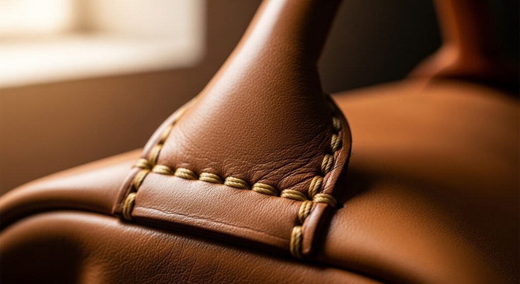 細かい返し縫いが糸の摩耗を防ぎ、長く使ってもほつれにくい構造に。