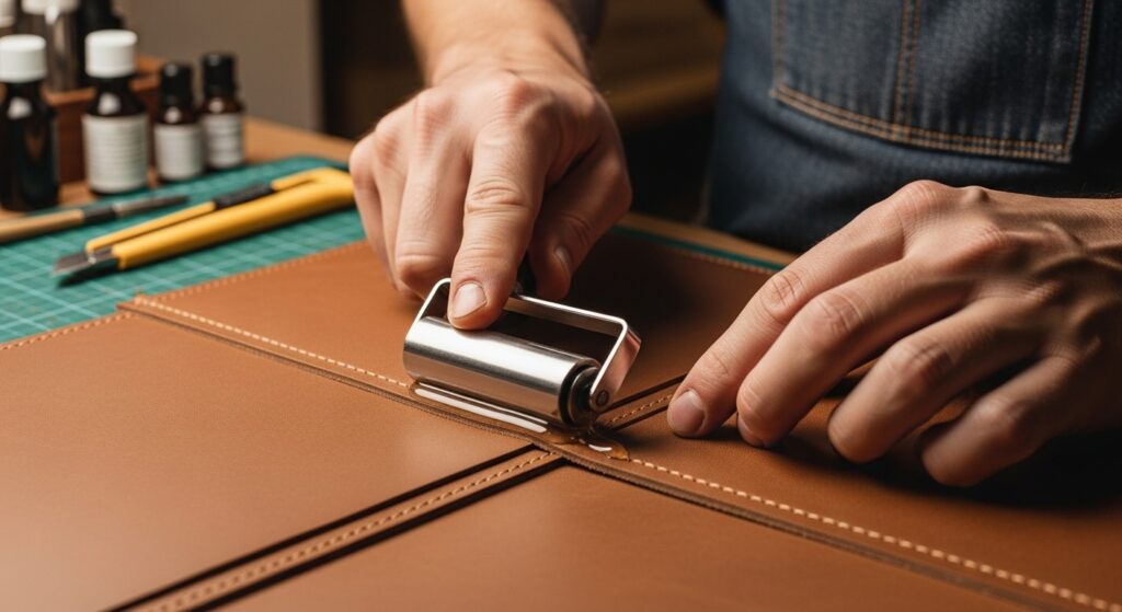 革や生地を接着剤で貼り合わせ、厚みや強度を持たせる加工。