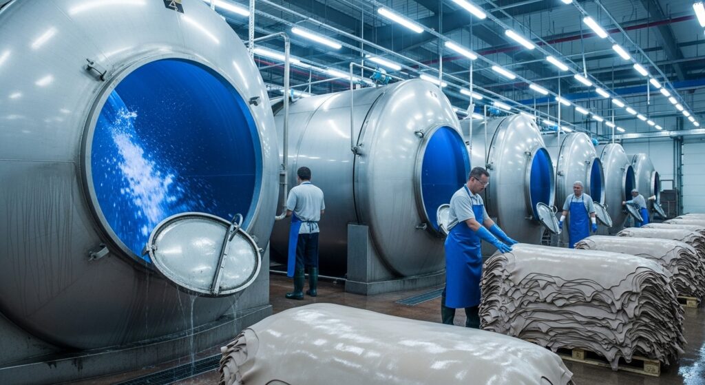 化学薬品を使い、わずか数日で安定した品質の革を作る効率的な手法。