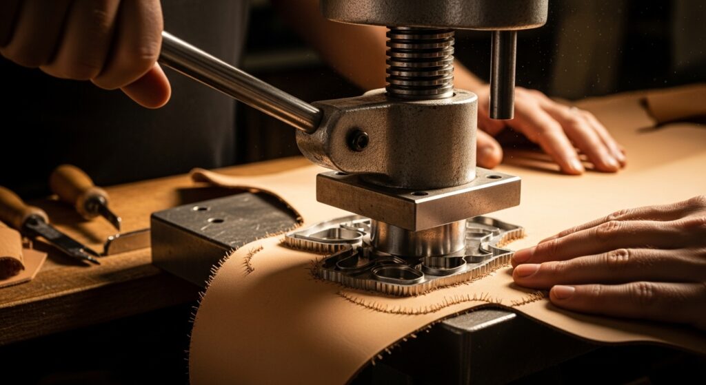 金属製の型を使い、革を一定の形に切り抜く工程。