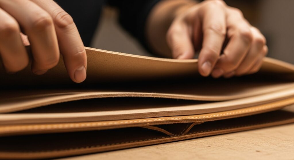 バッグや財布のフォルムを整え、耐久性と使い心地を高める役割を持つ。