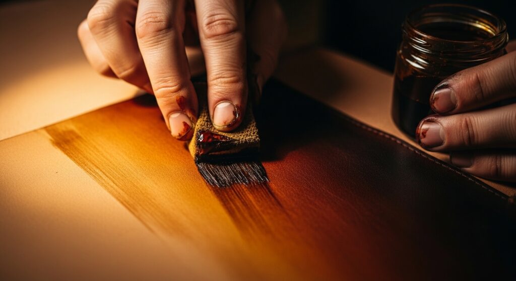 革の表面に職人が手作業で色を重ね、深みと濃淡を表現する仕上げ。