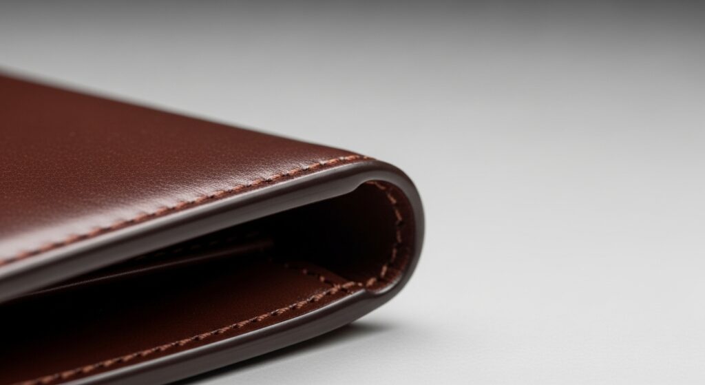 革の端を包み込むように処理することで、優しく高級感のある見た目に。