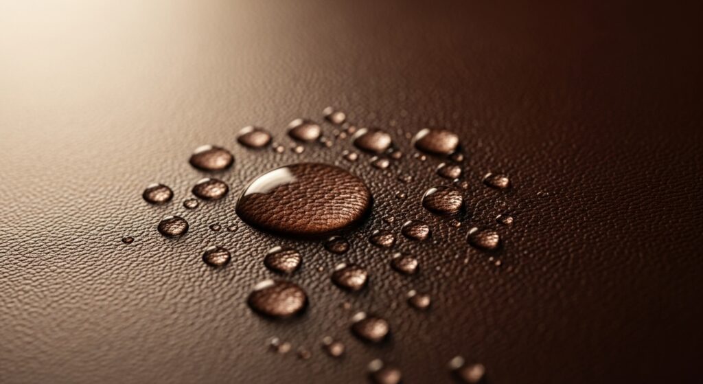 革の表面に撥水性のある膜を施し、水や汚れを弾く加工。