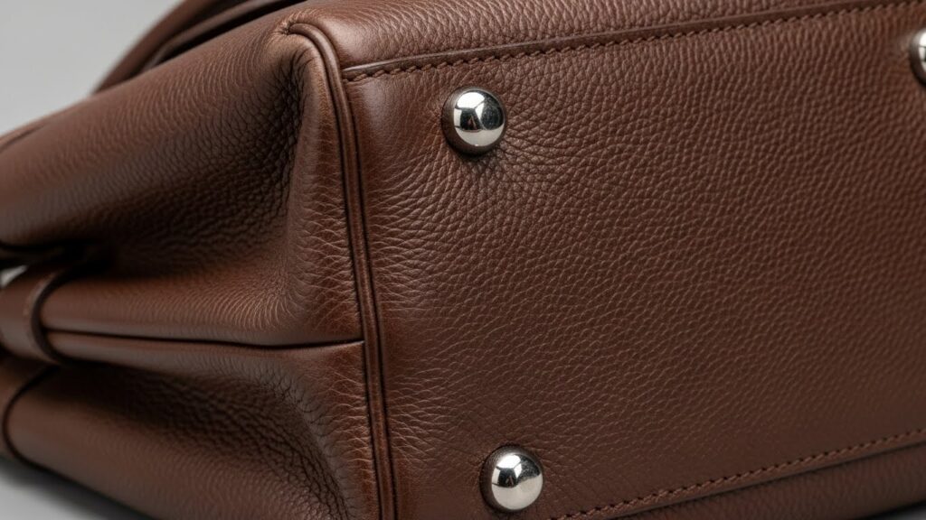 バッグ底面を保護するために付けられる小さな金属パーツ。置いたときの摩擦や汚れを軽減する役割がある。