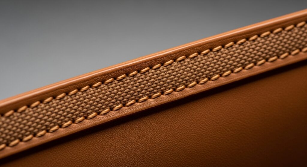 バッグ内部の縫い合わせ部分や切りっぱなしの端を覆うために使われる補強テープ。