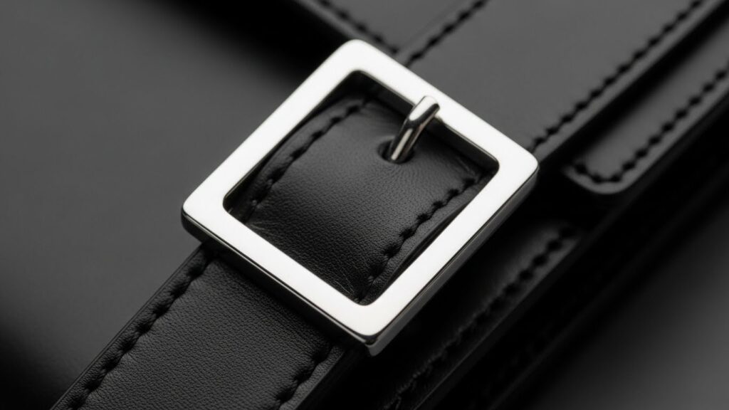 ベルト状のストラップを通して長さを調整したり固定したりする金属パーツ。強度とデザイン性を兼ね備える。