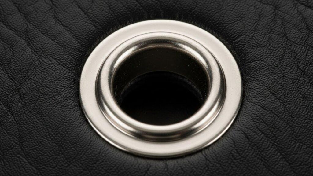 紐やストラップを通すために生地へ開けた穴を補強する金属パーツ。穴の周りを保護し、破れを防ぐ役割を持つ。