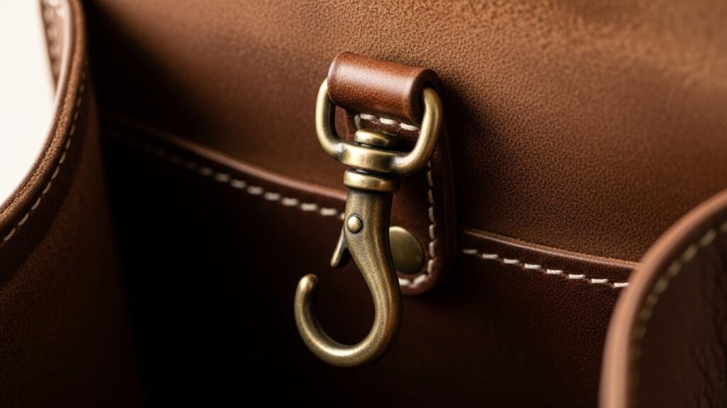 鍵をバッグ内部に固定するための金属フック。鍵が迷子にならず、素早く取り出せるようにする便利なパーツ。