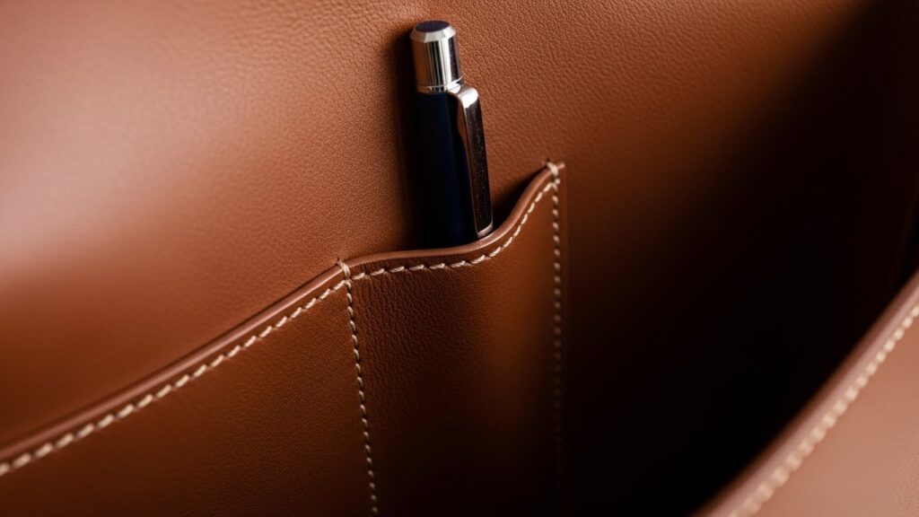 手帳や書類と併せて使いやすく、ビジネスシーンでの効率を高めるために多くのバッグに採用される。