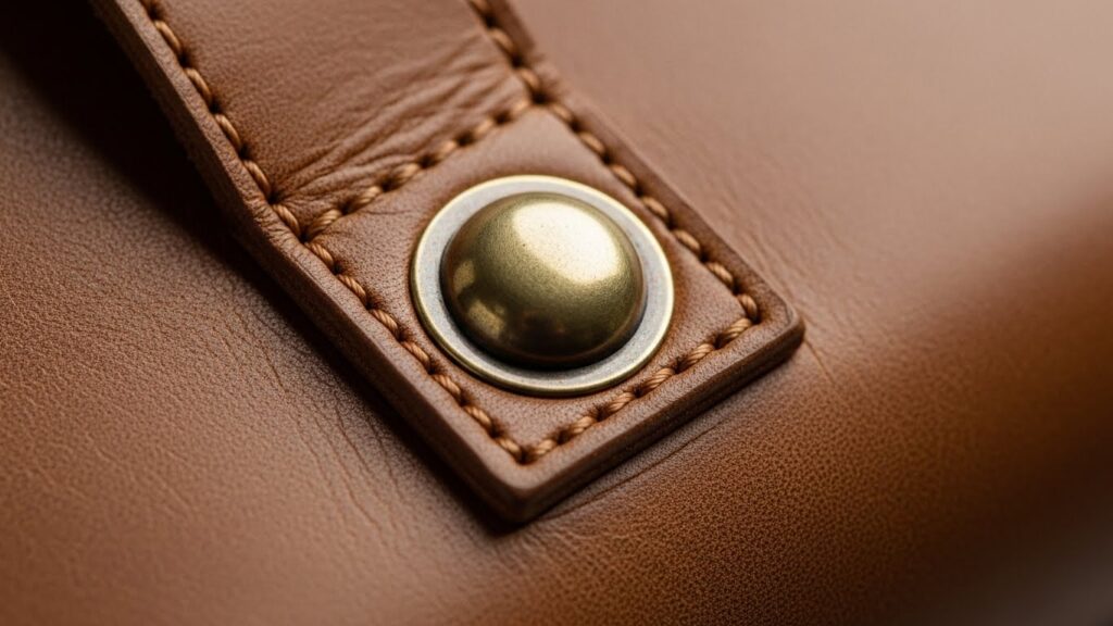 革や布をしっかり固定するために使われる金属製の留め具。バッグの補強や装飾として多用される。