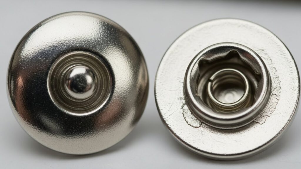 上下のパーツを“パチッ”と噛み合わせて留める金属製の留め具。小型で確実に閉じられるのが特徴。