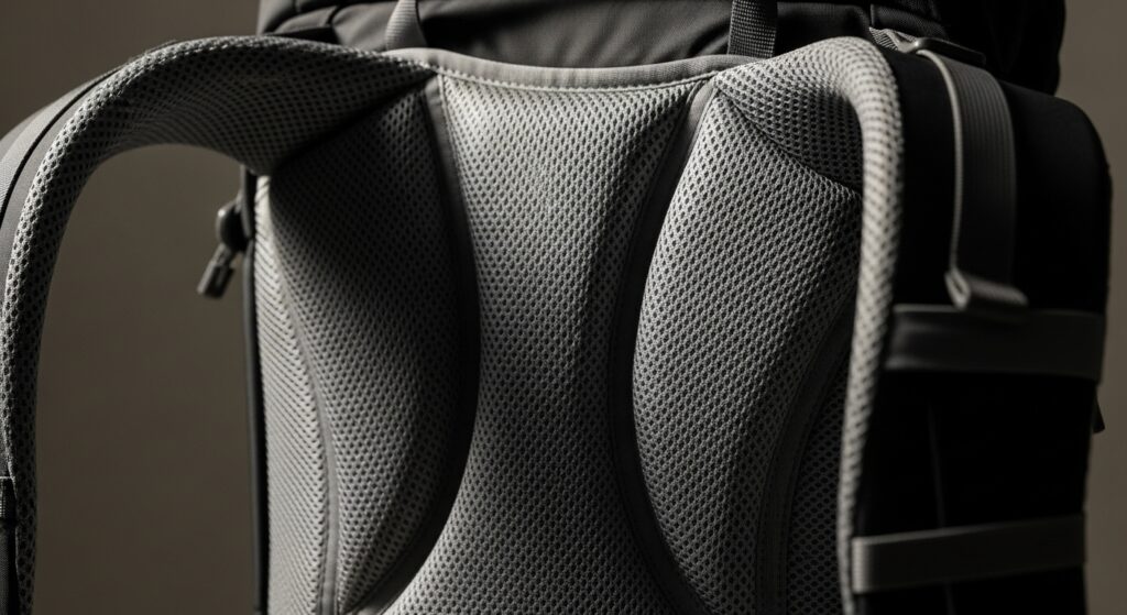 バッグの背面に設けられたクッション材。体への当たりを和らげ、長時間の使用でも疲れにくくする構造。