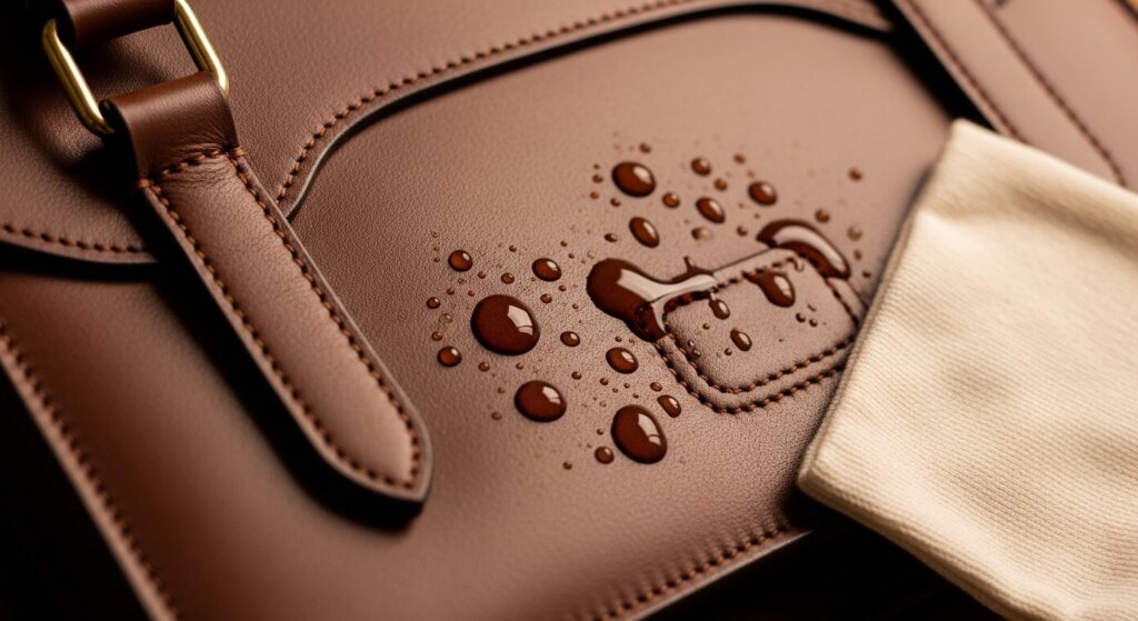 革や布の表面に保護膜をつくり、油や水分の付着を防ぐ。