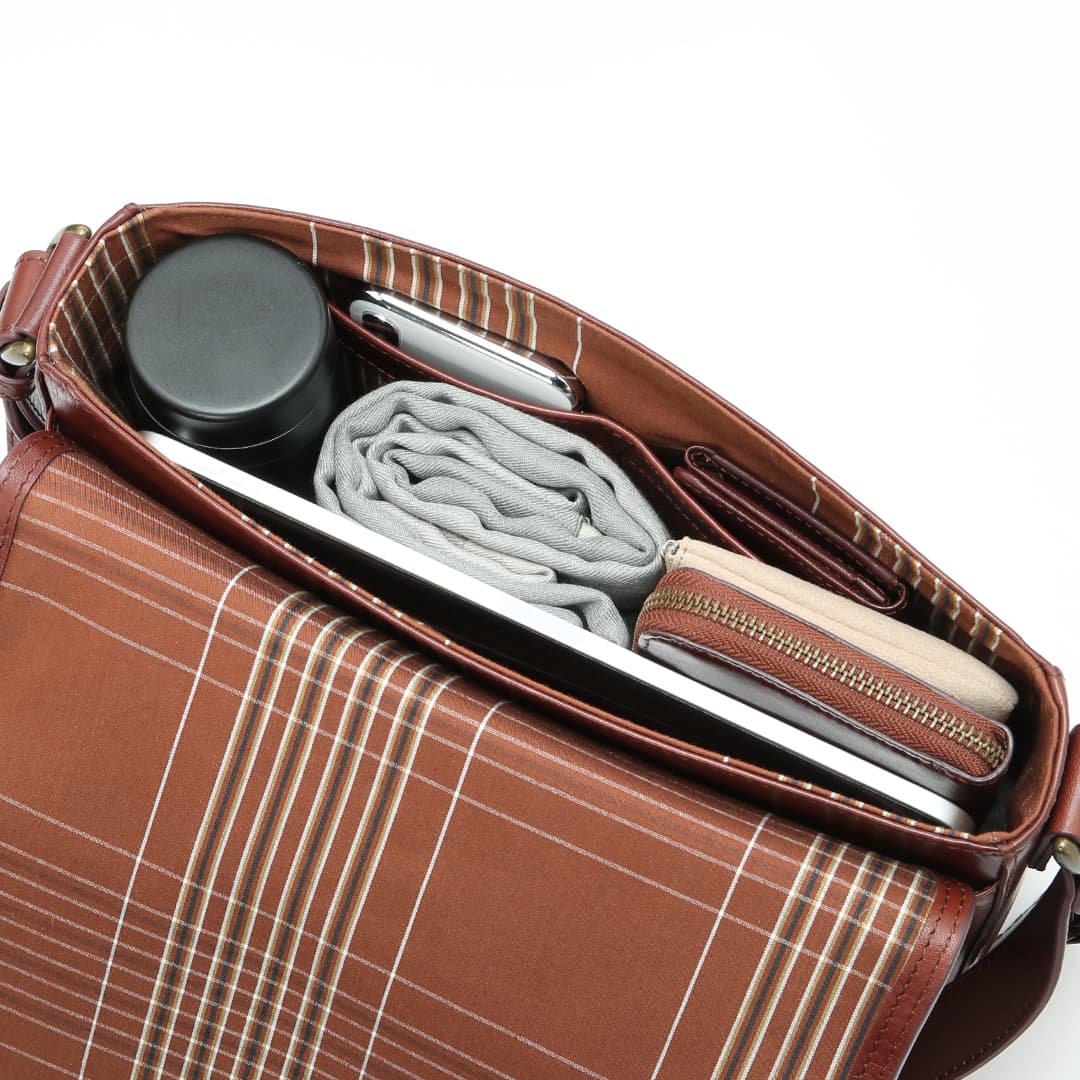 財布、鍵、メガネケース、タバコなど様々な小物類を綺麗に整理して持ち運びやすいショルダーバッグ。